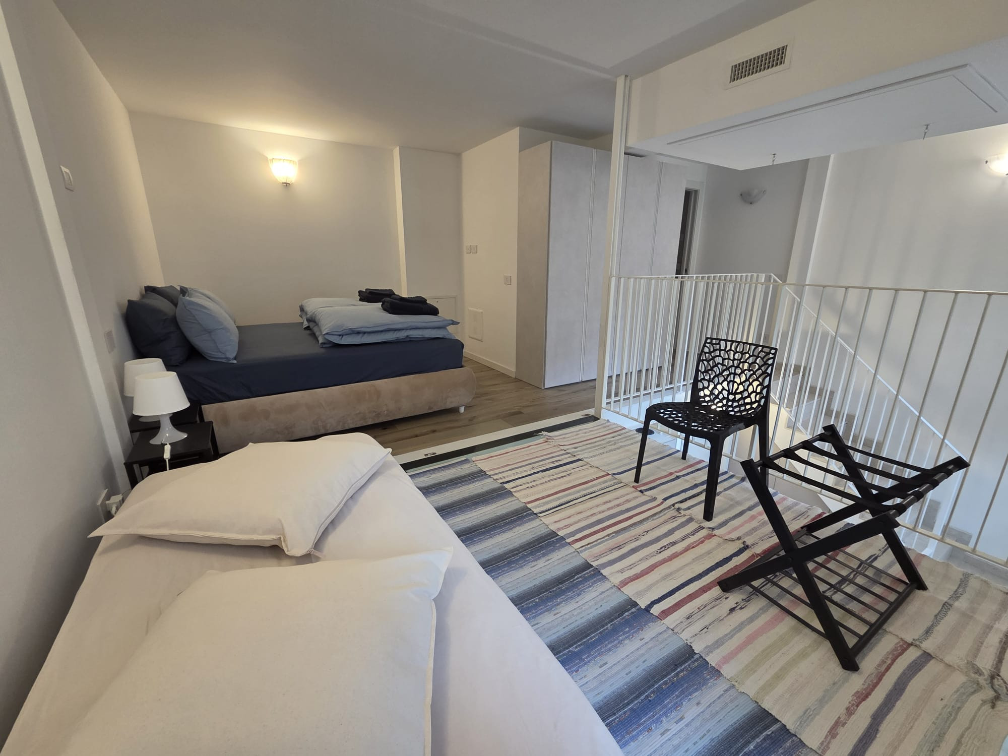 Mezzanine: sleeping area with double bed and single bed, second bathroom with shower.