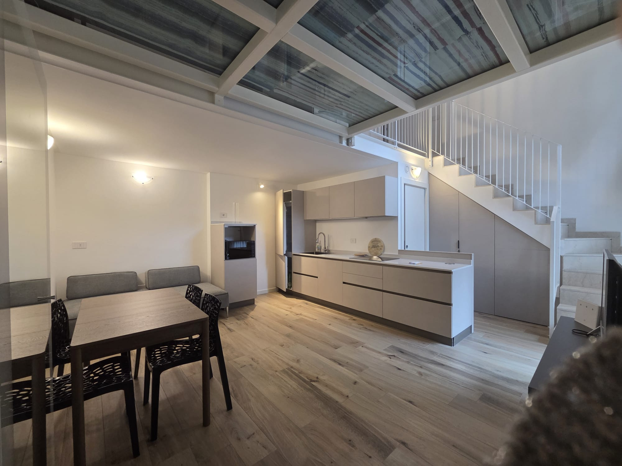 The loft, furnished with modern newly constructed furniture, is arranged on two levels: